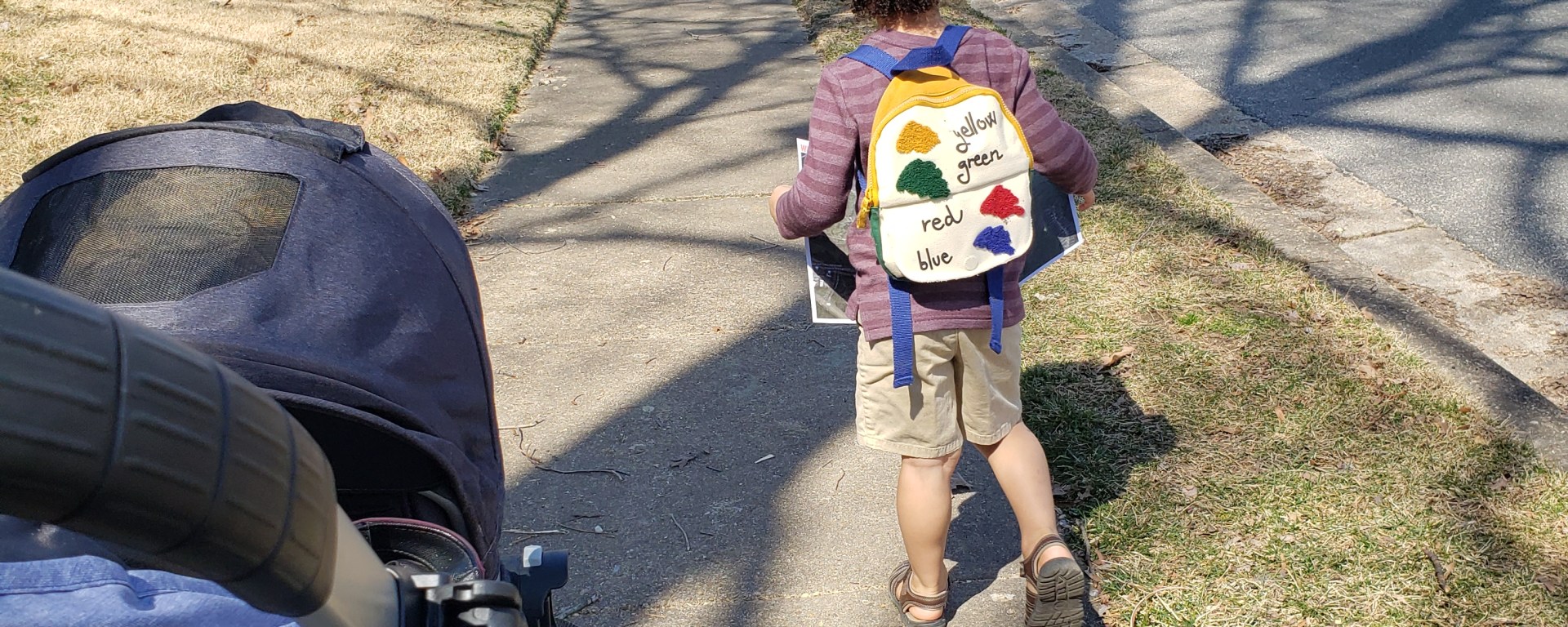 waiting for us. We opted to take the stroller since it was warm and sunny. Lincoln hopped in the front seat and off we went. Parker led the way with map in hand. We used our quest to continue practicing our directions, learning about the purpose of maps and continuing on our journey to learning to read. 2.5 miles and 45 minutes later to made it to the “X” on our map. Turns out The Thief Lord was tricky and led us all the way back home! We found my coffee mug in the mailbox.
