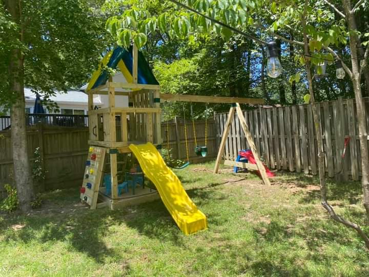 This past spring, we decided to go the DIY route after the pre-built playset we bought was back ordered and then canceled altogether. We ended up finding this DIY Alpine Custom Playset online and it’s perfect for smaller yards like ours. The kit itself was less than $200 and included two swing seats, a pair of safety handles, a multi-colored canopy, hardware and assembly instructions. The lumber was purchased separately, as were the additional accessories like a baby swing, steering wheel, and rock-climbing holds. We already had a big slide my in-laws gave us last summer. Brian had a few days off of work and used them to tackle what seemed like a daunting project. It took Brian about 4 days to complete with assistance from family and neighbors.