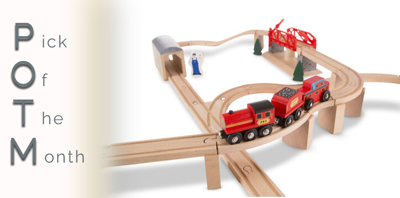 This simple train and tracks set have been an instant hit with my two-year-old. The tracks are easy for little hands to put together on their own. The different sizes and shapes make for countless ways to play. This set includes three magnetic train cars, and the tracks are generic enough to use any small wooden train on them.