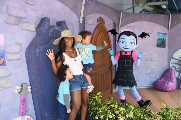 Animation Courtyard never received more than a quick glance from me. It’s always crawling with toddlers lined up to take pictures with Disney Jr. characters. and looked like land-of-the-strollers. Perfect! I saw Doc McStuffins and gave her a #BlackGirlMagic shout-out and then we saw Vamparina. I was sure this would get Parker out of his funk. He went through a phase of watching her show at home. I stood in line with Lincoln, he seemed excited, and when it was our turn for a picture, Brian ushered Parker up to the front with us. The most we got out of him was a partial scowl.