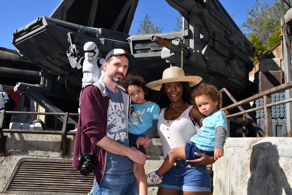 Our second visit to the park that day started much like our first with a pass-through of Toy Story Land to Star Wars: Galaxy’s Edge. Brian and I got in line for Millennium Falcon: Smugglers Run. Link and Park left with Gma and Papa to go back to Toy Story Land to ride Toy Story Mania!. I didn’t know anything about this ride so I was a little nervous and then we get a call from Gma. Parker decided he wanted to get on the grown-up ride with Daddy. The line was long but was moving quickly. So while Brian made his way past all the people behind us so he could get Parker, I had to get my nerves in check. I told the people directly behind me that my husband was going to be coming back with our four year old who was going to be brave and get on this ride. His first big ride. I asked them all to cheer, “Go Parker!” and give out high-fives when Brian and Parker got back. They happily obliged and it seemed to give Parker that boost of confidence he needed. I needed him to be pumped because at that point we were closer to the front of the line than the end. He was so nervous; I could feel his little body shaking in my arms. I zipped him in my sweatshirt and rocked him in my arms a little bit to calm his nerves.