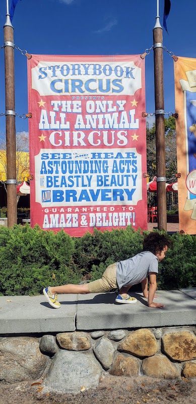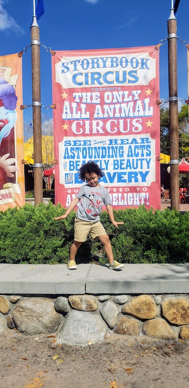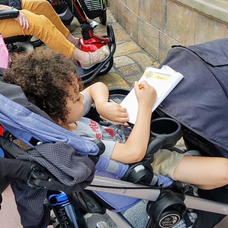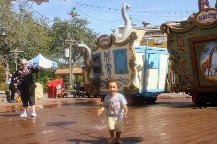 On the far end of Fantasyland, you can find the Casey Jr. Splash N Soak attraction. My two-year-old was thrilled to run through the stationary locomotive cars inspired by the Disney classic, Dumbo. The weather was warm and sunny making it ideal to get sprayed with water by the circus animals on board. Parker didn’t want to get wet and instead wanted me to pose for photos while Lincoln and Gma cooled off.