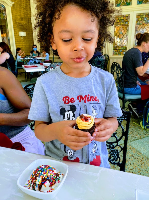 A new experience I had at Magic Kingdom was Mickey’s PhilharMagic, a 3D attraction in “the Concert Hall in front of the 150-foot-wide, 180-degree seamless wraparound screen.” The boys sat through the experience and even reached out to grab some of the 3D objects. They seemed to be warming up to the idea of the attractions. Afterward, Parker opted out of riding the carousel and chose to sit in the stroller and work on his sketches. Lincoln experienced pure joy riding the carousel over and over again.He was understandably upset when we left for our lunch reservation at Tony’s Town Square Restaurant located on Main Street, U.S.A., right at the entrance to the park.