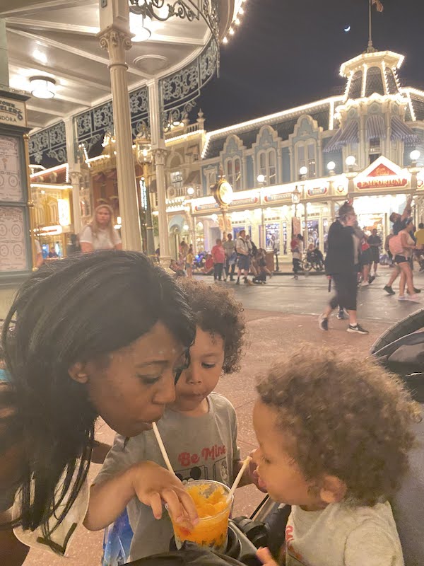 We made our way back to Fantasyland again stopping to take pictures of the boys in front of Cinderella’s fountain and to ride the carousel a few more times. Brian ventured off to photograph the last of the golden statues. We had a Lightening Lane reservation for “It’s a Small World” but at the last minute we decided to scrap that plan and head back to the front of the park to make sure we got silhouettes of the boys. Parker had one made when we visited in 2018 and it was important to us that we get another one during this visit with both boys. This sounds crazy but we ended up waiting an hour to have it done because the artist had just left for their dinner break when we arrived. We chatted up the cast members that were there to secure our place in line and then we browsed the gift shops on Main Street USA until it was our turn. I got a pretty, frozen, candy decorated slushy for the boys to enjoy since they were such good sports while we waited.
