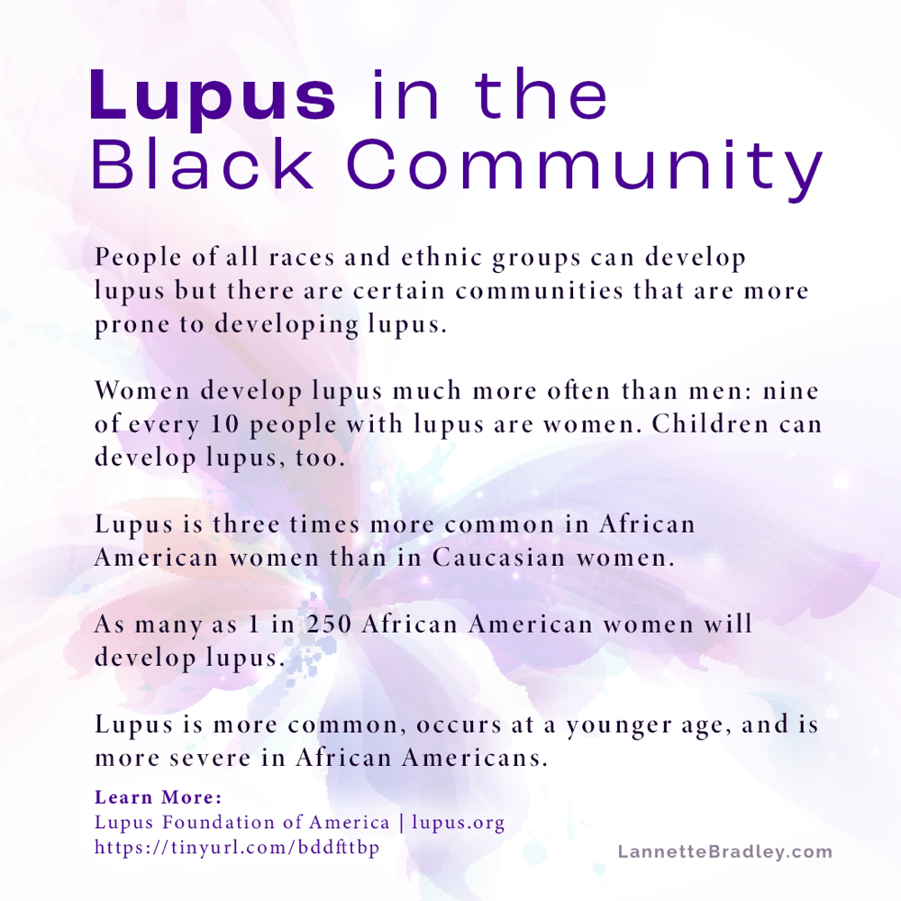 Per the CDC, ninety percent of people with lupus are women. That’s me! It is still unknown why Black and Latina women are 2 to 3 times more likely than White women to develop lupus. That’s me again! A CDC study, published in 2019, examined the death rates among people with Systemic Lupus Erythematosus. “Black people had higher rates of death than White people, and deaths occurred sooner after diagnosis. Among those with SLE, Black people were significantly younger when they died than White people (average age of 52 vs. 64).” As a Black woman, I must educate myself, my family, and community about a chronic illness that drastically affects us.