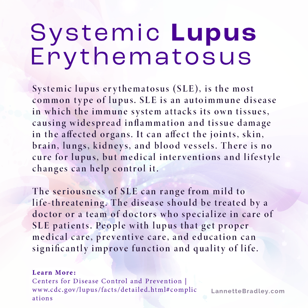 Lupus is a life-long chronic autoimmune disease that can damage any part of the body (skin, joints, and/or organs inside the body). Systemic Lupus Erythematosus (SLE), is the most common type of lupus. The other types of lupus include Cutaneous lupus (skin lupus), drug-induced lupus which is similar to SLE but occurs as the result of an overreaction to certain medications, and Neonatal. Lupus is not cancer and it’s not something you can catch.