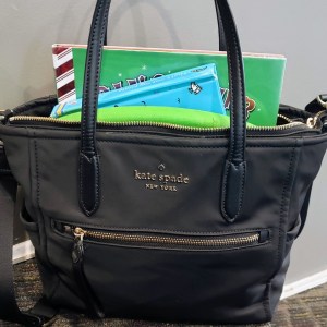 Fast forward to 2022. Neither of my children is in diapers anymore and I wanted to downsize. I decided to stick with nylon because they are easy to clean which is still an important factor for me when choosing an everyday bag. This Chelsea Medium Satchel is sleek and efficient. It is small enough not to weigh me down and just big enough to fit my laptop. I was impressed to find that I could fit two Fire tablets in there….with the kids’ cases on them! After years of carrying a tote, I didn’t think I’d like the strap but it comes in handy when I’m juggling both boys and shopping bags. When I’m not carrying our electronics, I have plenty of room for my wallet, wipes, keys, lipglosses, and snacks that inevitably spill out into the bottom. Hence the need for a bag that is easy to clean. There is a nifty little elastic pocket on the interior side that is perfect for holding a set of keys. There are also exterior side pockets, perfect for lip balms on the left and your phone on the right. The secondary top zipper pocket is now exclusively used to carry crayons and small pieces of paper for when I’m out with the boys.